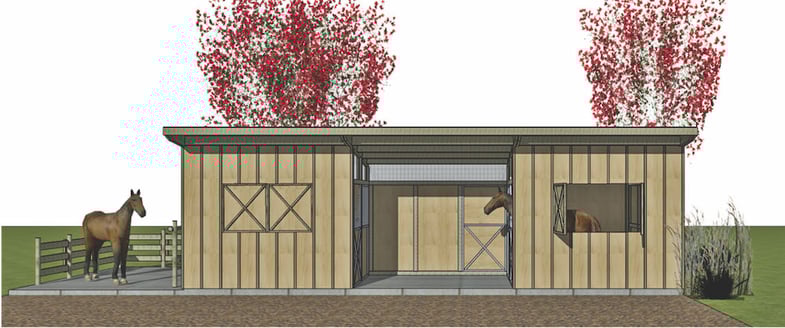 The covered area in between the two stalls is great for grooming or feeding. At the back of the covered area there is also a tack room for storing feed and tack equipment.