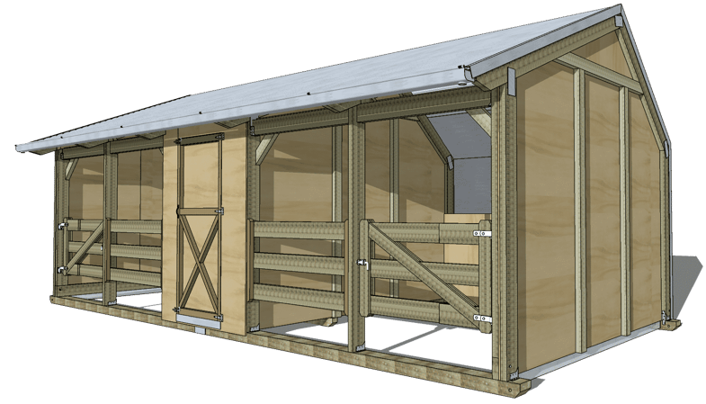 The stalls in this design are 3.5m deep x 2.9m wide which is a great size for most horses 14-16 hands high. Plywood kickboards cover the back wall of the stalls to protect the shed back wall as well as your horses legs if they decide to kick it. The front gates and rails are made from strong timber or you can choose metal framed stall front walls and gates if you prefer.