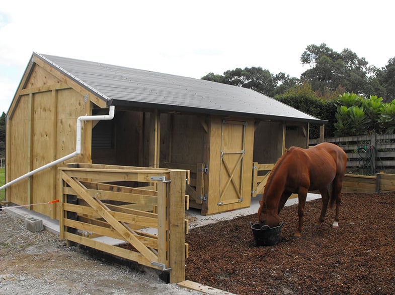 This customer chose to lay a concrete pad to build their Outpost stable on. They wanted it to be there permanently with no intentions of moving it in the future. The stable is bolted onto the concrete pad and they cut out the timber under the gates at the front of the stalls because they are not needed for strength if the stable is not being moved. This customer chose the Colorsteel upgrade and also added their own downpipe for water collection - the front gutter on the building is included in the kitset.