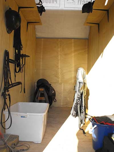 Pictured to the right is an inside view of the tackshed. The customer has added their own shelving on the walls. The Outpost Tool Racks are a great accessory for hanging your bridles and halters on.