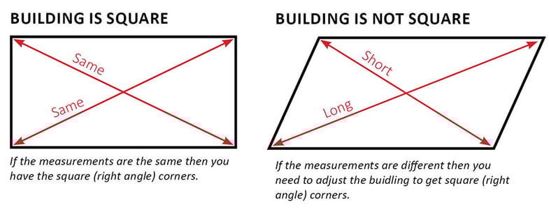Getting building walls square will ensure parts like plywood walls and doors are easy to install. An extra 10 minutes checking everything's square in the early stages of building assembly could save you hours later on.